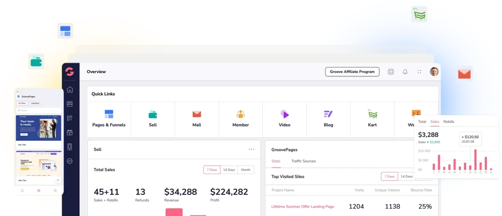 GrooveFunnels (now called Groove.cm) is another all-in-one marketing platform that promises it all – pages, funnels, emails, carts, affiliate management, webinars, and more. It was marketed by Mike Filsaime as a ClickFunnels alternative with a lifetime deal option. I took a look at it, and the vision is big: it includes a funnel/page builder (GroovePages), a shopping cart (GrooveKart), an email campaign tool (GrooveMail), membership sites, video hosting (GrooveVideo), affiliate management, and even webinars.