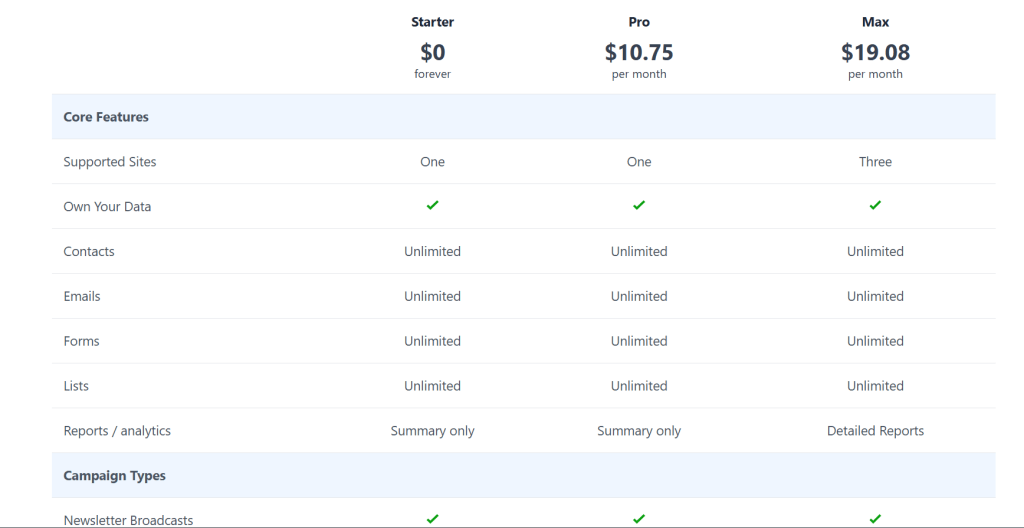 - Unlimited Contacts & Newsletters: No limits on list size or number of mailouts (on free plan).