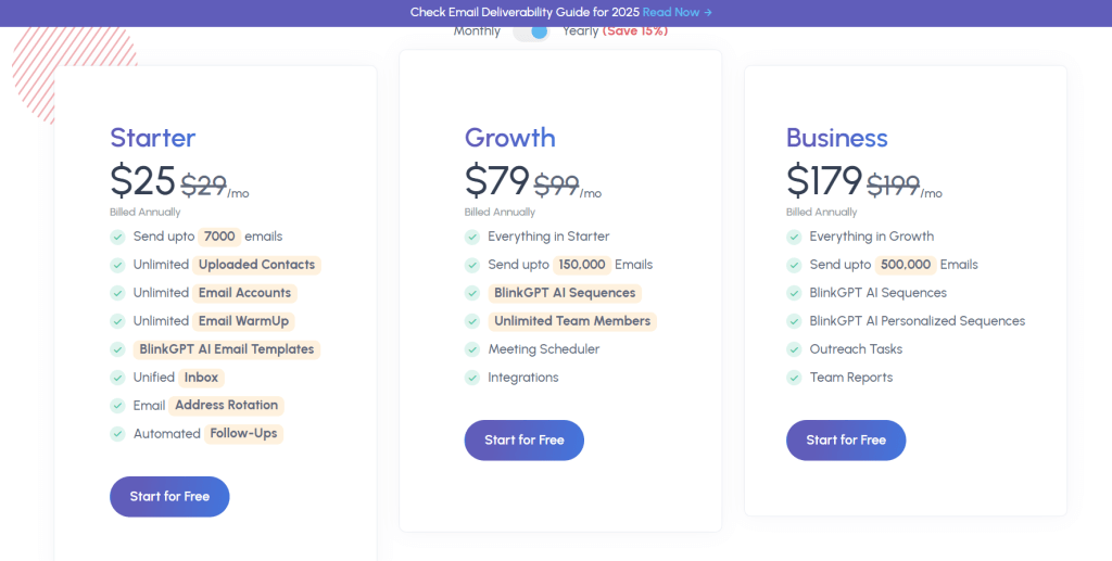Pricing is high-end, though: no free plan beyond a 7-day trial. Starter is about $25/mo (up to 7,000 emails), then Growth about $79/mo (150,000 emails), Business about $179/mo (500,000 emails). That’s a lot of emails, it’s for businesses sending tens of thousands of cold emails a month.