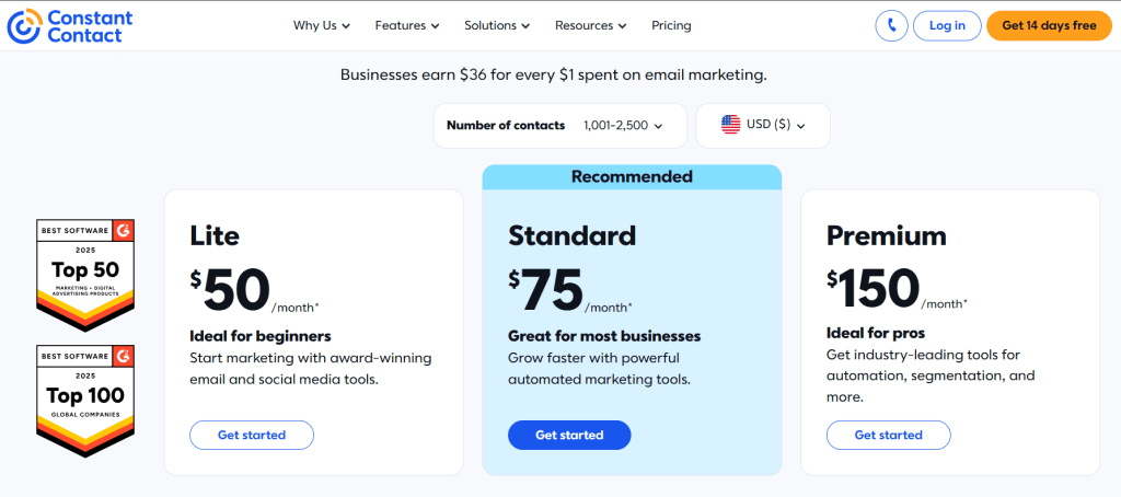 Constant Contact does NOT have a free plan (just a 14-day trial). Pricing starts around $12/mo for up to 500 contacts (Lite plan) and rises steeply as your list grows. It’s definitely more expensive than the other tools we’ve seen.