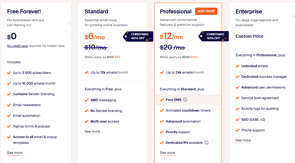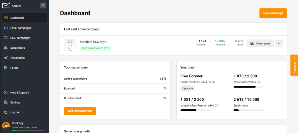 Among all these free email automation tools for small business, I found Sender truly stands out. It’s a cloud-based email and SMS marketing tool, and they offer a generous free plan. I tried it myself and it lets you have up to 2,500 subscribers and send 15,000 emails a month for free. For small businesses or bloggers, that’s like a dream deal.