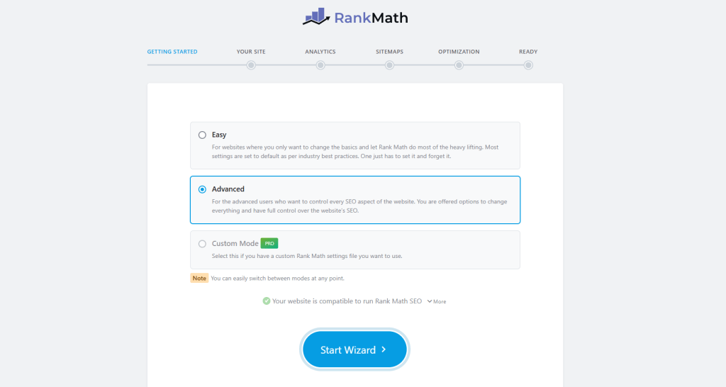 - Run the Setup Wizard: After activation, RankMath will launch an initial setup wizard. Choose an SEO mode (Easy, Advanced or Custom) based on how much control you want. I usually pick the Easy mode first. Connect your (free) RankMath account to unlock more features and link Google Analytics/Search Console if you have them. Fill in your site information (site type, logo, social profiles) as prompted.