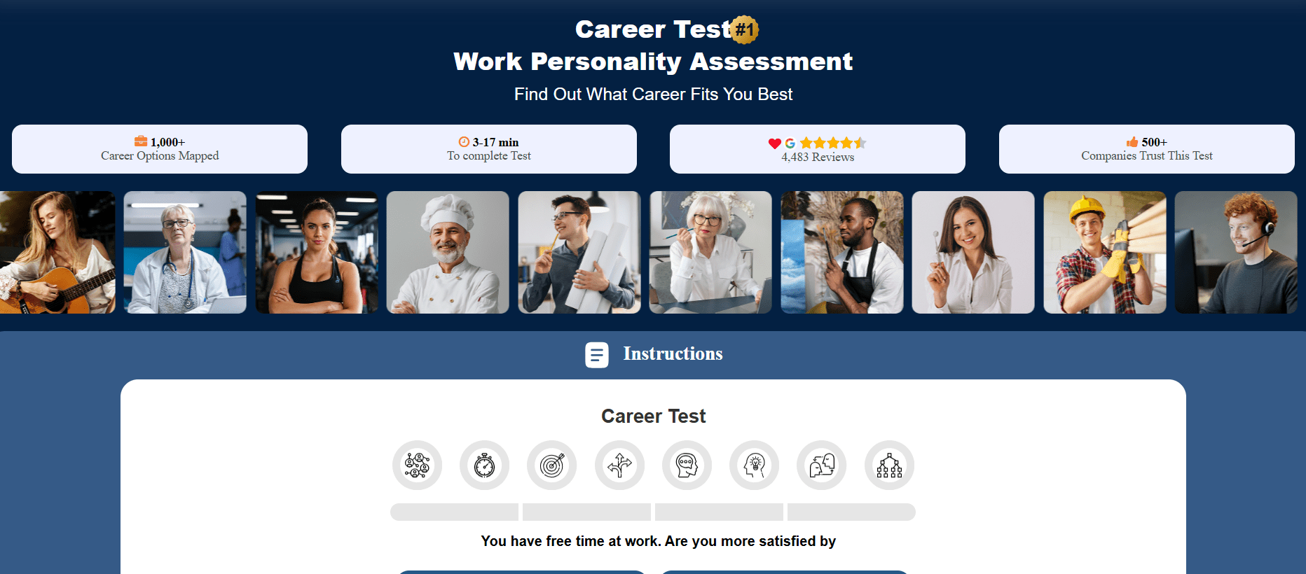 CareerFitter stands out among best online career assessment tool, blending a scientifically refined work personality test with an Aptitude & Aversion (A³) assessment to deliver precise, confidence-building career direction. Trusted for over 25 years, it serves both students and adults seeking career discovery, offering a polished and user-friendly experience.