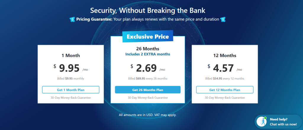 26-Month Plan: $2.69 per month (billed $69.95 every 26 months). This one is crazy value. They even throw in 2 extra months for free, which makes it one of the cheapest deals in the VPN world. If you know you’ll be using a VPN long-term, this is hands-down the best option.