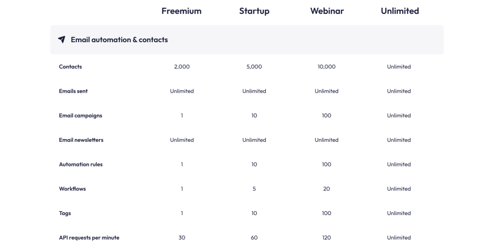 So the Systeme.io free plan vs paid plan difference is mostly about how many contacts, funnels, courses, and domains you need. Even on the Free plan, you get unlimited emails and storage. And there are truly no hidden fees or upsells; everything is clear. No one-time lifetime deal here (that’s more Groove.cm’s thing). Instead, you get a free tier as a permanent “lifetime” plan, which many users love.