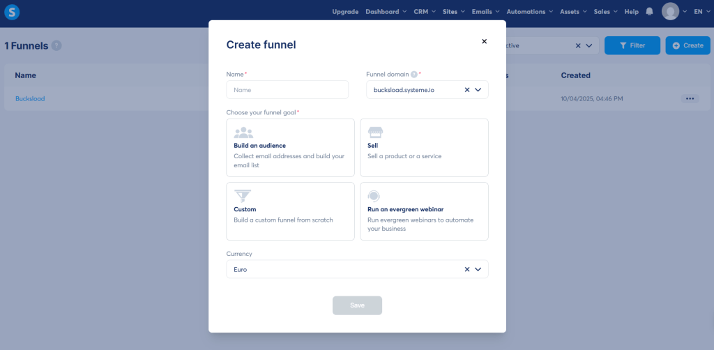 Let’s talk specifically about funnel building, since that’s often the main reason to look at such platforms. In Systeme.io, making a sales funnel is done through a simple guided flow: