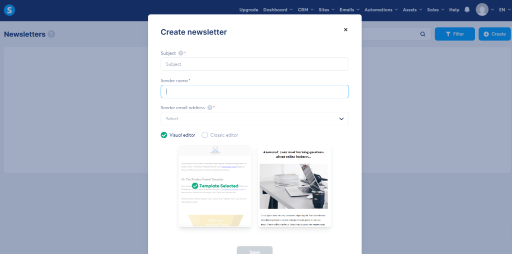 - You can create email templates or plain-text emails with drag-and-drop or HTML.
