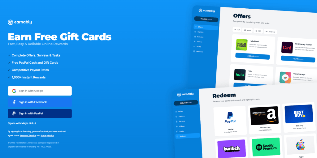 Earnably is a UK-based GPT site run by Humblefox Ltd. You can earn points by doing surveys, watching videos, downloading apps, or completing offer walls. I signed up and gave it a try. One convenient thing is the low minimum cashout (only a few dollars for gift cards or PayPal). People from many countries can use it too, as long as tasks are available in your region.