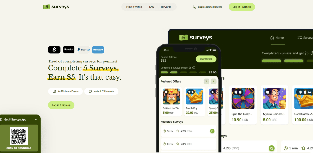 FiveSurveys is very straightforward: complete five surveys and get $5. It’s run by a legitimate US market research company (Prime Insights Group). The math is simple – $1 per completed survey, $5 for five surveys.