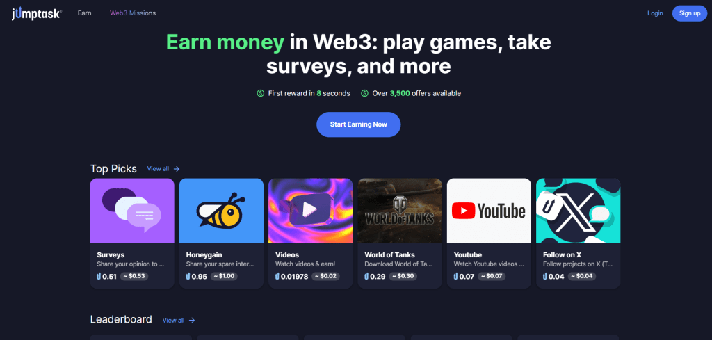 JumpTask was one of the first GPT platforms I tried. It’s actually one of the legit GPT sites that actually pay, but it pays only a few cents per task. I remember downloading the app and doing tiny tasks on my phone such as short surveys, mini-jobs and watching quick videos. They even have a feature called “PlayTime,” where you share spare internet bandwidth for extra reward (partnered with Honeygain). Everything was easy, but here’s the catch: the reward is super low. I did a 5–10 minute task and earned only a couple of pennies.