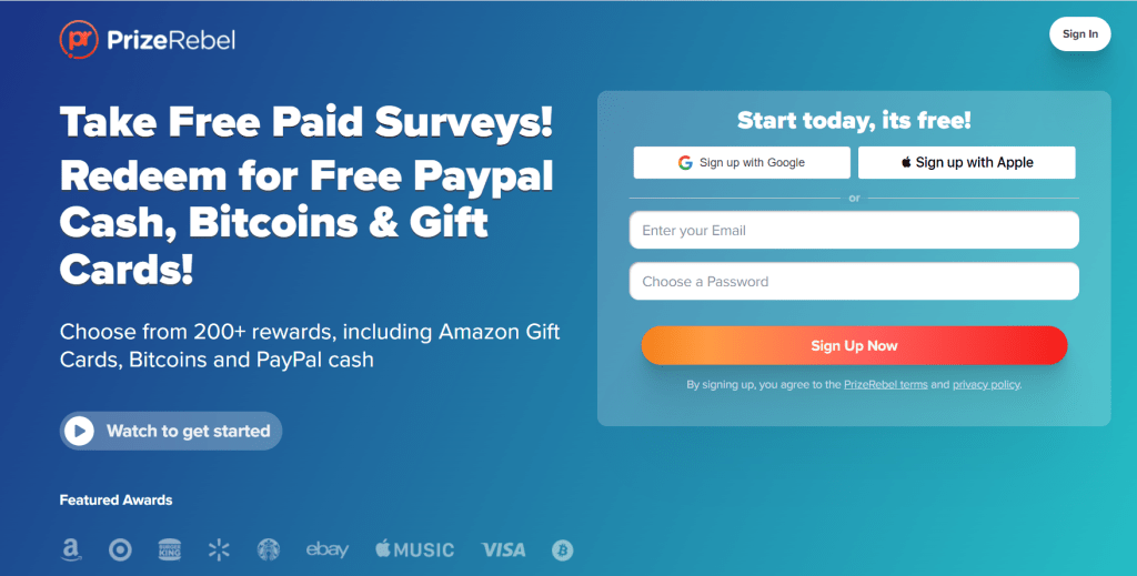 PrizeRebel has been around since 2007. It’s a classic rewards site where you earn points for tasks and then exchange points for cash or gift cards. On PrizeRebel, you earn 1 point per cent, and you only need 200 points to get a $2 reward. You can then cash out via PayPal or dozens of gift cards.